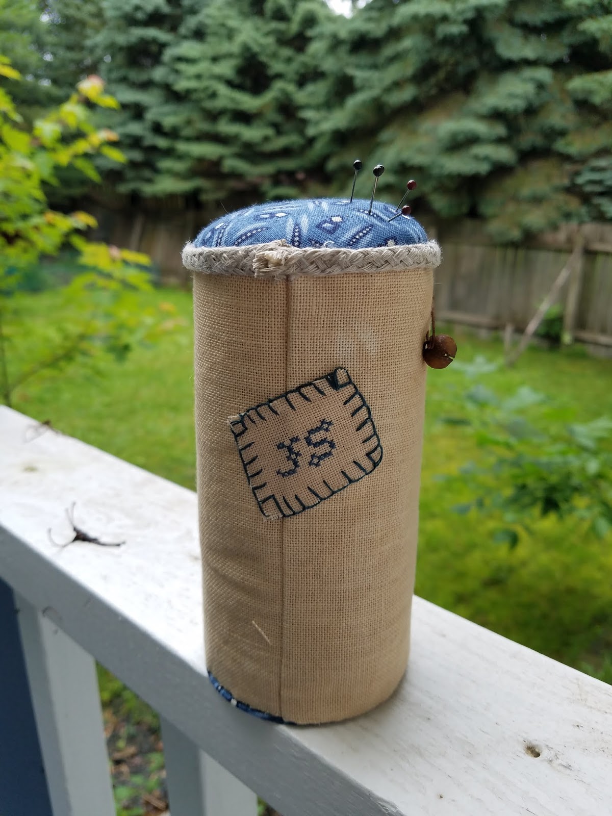 I stitched my initials on a piece of linen and stitched the linen on the back of the drum.