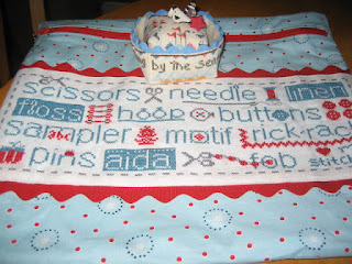 The little basket and pincushion was stitched on 32 ct. cream with DMC threads.